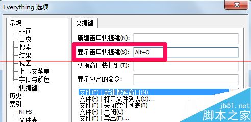 7、那么我们怎么快速调出everything呢?在左侧选择快捷键,然后在右侧根据自己习惯来设置快捷键就好了。这样我们平时关闭everything,保持电脑界面清爽,等使用的时候按快捷键就可以使用了。