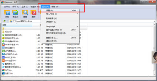 打开快压压缩软件,我们使用“选项”菜单中的“设置”项。