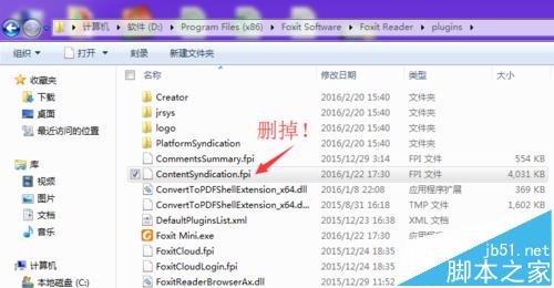 2、继续打开“plugins”(插件)文件夹,找到 ContentSyndication.fpi,就是这个讨厌的东西!改掉后缀名或者删除它!