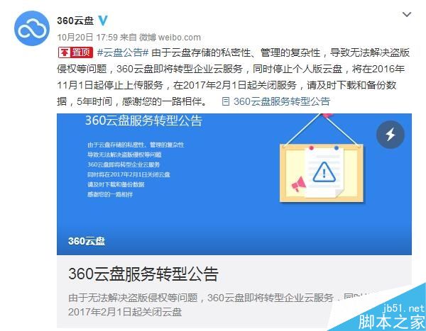 昨晚,国内网盘又出了一个大事件,360云盘宣布2017年2月1日起关闭所有的云盘账号并清空数据。这也是今年网盘关停潮平息半年后的又一重磅事件。