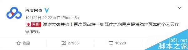 对此百度网盘在官方微博回应:谢谢大家关心!百度网盘将一如既往地向用户提供稳定可靠的个人云存储服务。