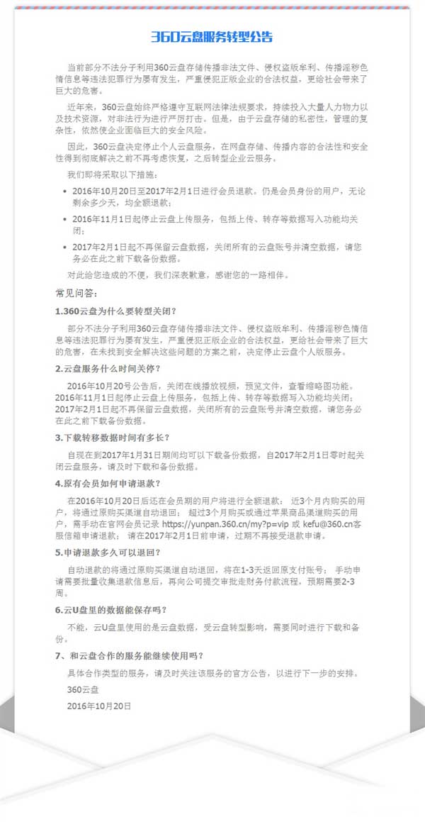 在2016年10月20日后还在会员期的用户将进行全额退款:近3个月内购买的用户,将通过原购买渠道自动退回;超过3个月购买或通过苹果商品渠道购买的用户,需手动在官网会员记录https://yunpan.360.cn/my?p=vip或kefu@360.cn客服信箱申请退款;请在2017年2月1日前申请,过期不再接受退款申请。