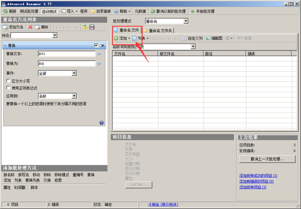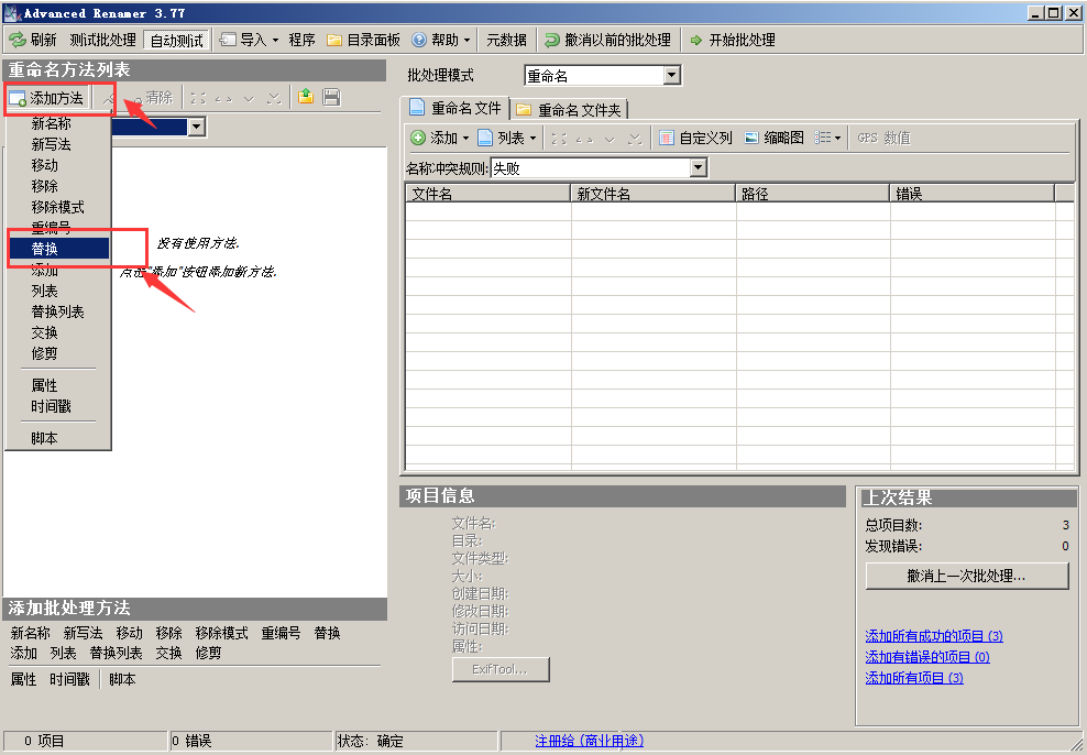 打开运行界面以后,左侧的 添加方法 > 然后 替换