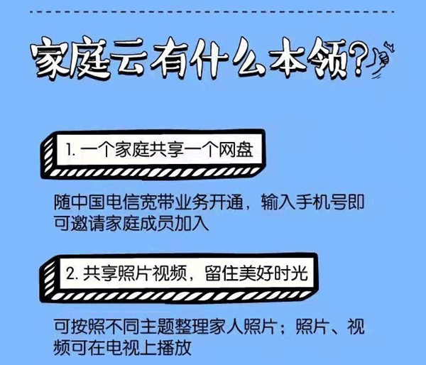 据了解,“家庭云”随中国电信宽带业务开通,输入手机号即可邀请家庭成员加入。支持电脑、手机、电视数据共享,可按照不同主题整理家人照片,照片、视频可在电视上播放。