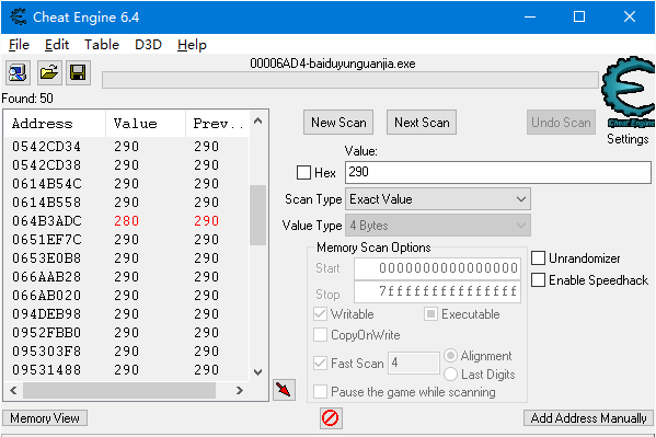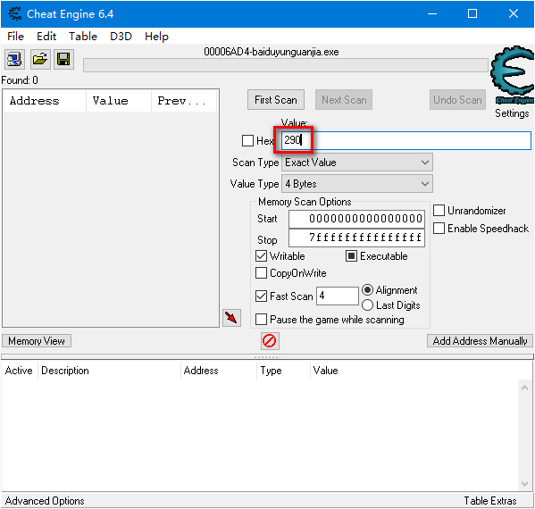 在“Value输入框”中输入290,目的是查找出内存存储的倒计时数据,并修改这个数值。