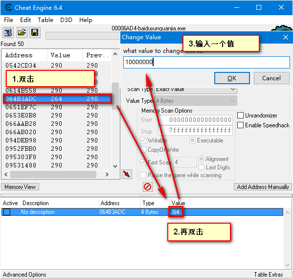 之后切换到百度网盘客户端,点击“免费试用”(前提是大家已经用百度网盘客户端开始下载各种文件)后,快速转到Cheat Engine,当倒计时到达290秒时,点击“First Scan”。把Cheat Engine左侧的列表向下拉,会发现一个红色的倒数数据,这个就是300秒试用倒计时存贮的数据。