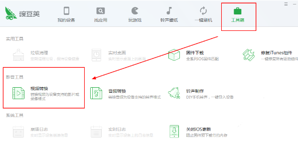 1、首先打开电脑中的豌豆荚,然后在其界面顶部的功能分类中打开“工具箱”,在“影音工具”中找到“视频转换”并打开它;