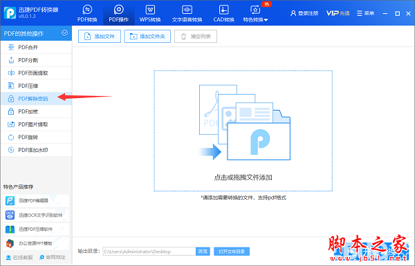 打开迅捷PDF转换器,进入界面,在左侧点击【PDF的其他操作】,选择【PDF解除密码】功能,