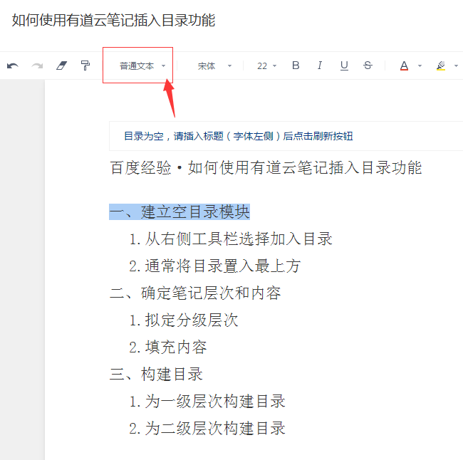 我们使用目录功能是为了快速索引到笔记的各层次内容,因此我们需要先写一篇具有层次的笔记。通常,我们可以采用中文编号代表一级层次,然后用阿拉伯数字代表二级层次,最后有需要还可以用字母代表三级层次。如下图所示。