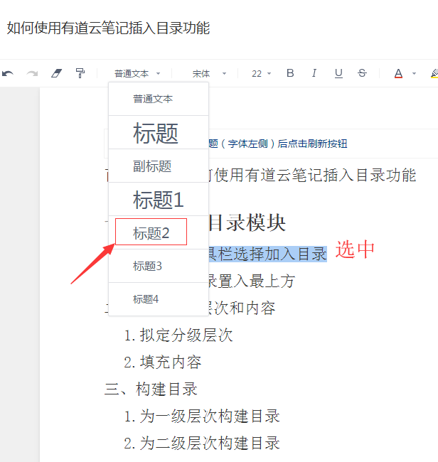 构建方法和一级目录大同小异。首先选中二级层次的内容,然后在普通文本的下拉菜单内点击“标题2”即可。二级层次的内容也被加粗了。三级目录同理。