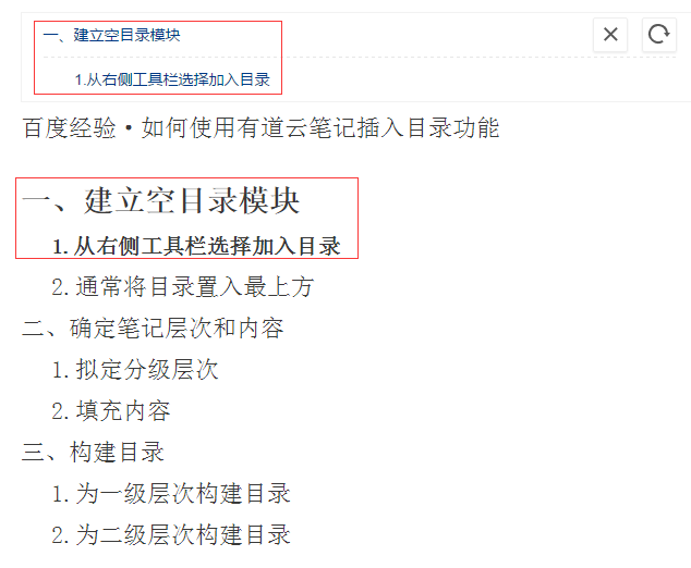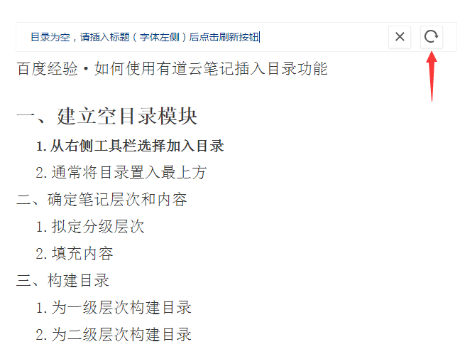 回到笔记开头的空目录里,点一下,可以看到右侧出现了两个按钮,关闭和刷新,我们点击一下刷新按钮,可以看到方框内更新了我们刚才设置的目录内容。