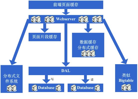 突然有一天,发现这个完美的时代也要结束了,数据库的噩梦又一次出现在眼前了,由于添加的webserver太多了,导致数据库连接的资源还是不够用,而这个时候又已经分库分表了,开始分析数据库的压力状况,可能会发现数据库的读写比很高,这个时候通常会想到数据读写分离的方案,当然,这个方案要实现并不 容易,另外,可能会发现一些数据存储在数据库上有些浪费,或者说过于占用数据库资源,因此在这个阶段可能会形成的架构演变是实现数据读写分离,同时编写一些更为廉价的存储方案,例如BigTable这种。