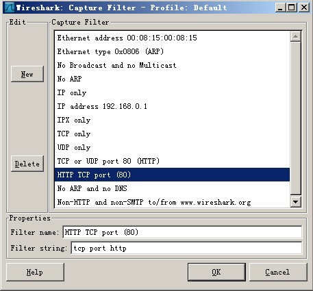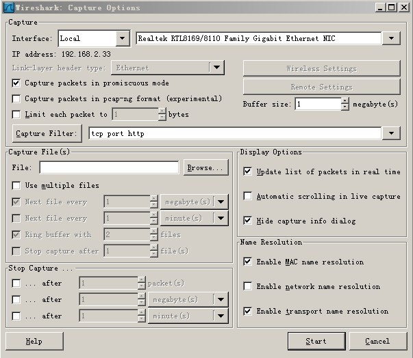 一般读者只需要选择最上边的下拉框,选择合适的Device,而后点击“Capture Filter”,此处选择的是“HTTP TCP port(80)”,选择后点击上图的“Start”开始抓包。