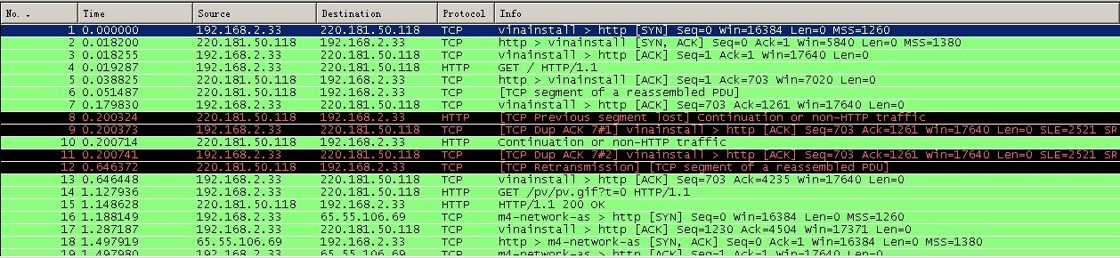 1)No1:浏览器(192.168.2.33)向服务器(220.181.50.118)发出连接请求。此为TCP三次握手第一步,此时从图中可以看出,为SYN,seq:X (x=0)
