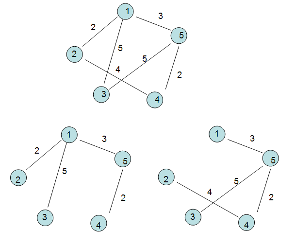 其实一句话总结就是:生成树是将原图的全部顶点以最小的边连通的子图,这不,如下的连通图可以得到下面的两个生成树。