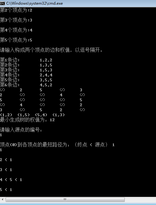 Console.WriteLine("\n请输入构成两个顶点的边和权值,以逗号隔开。\n");