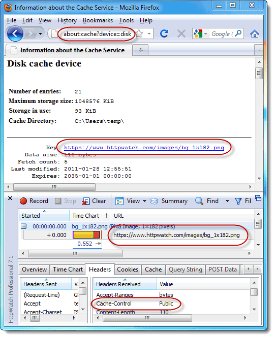 Firefox默认只在内存中缓存HTTPS。但是,只要头命令中有Cache-Control: Public,缓存就会被写到硬盘上。下面的图片显示,Firefox的硬盘缓存中有HTTPS内容,头命令正是Cache-Control:Public。