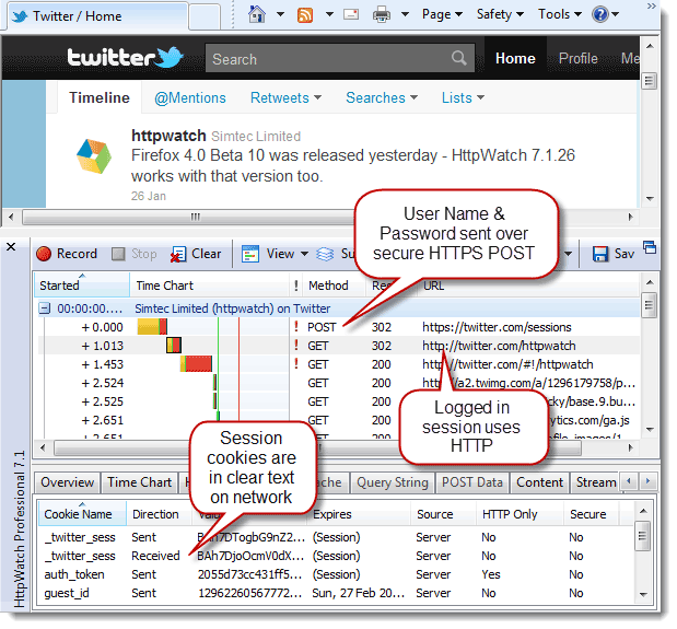 也就是说,这些cookie是在HTTPS环境下建立的,但是却在HTTP环境下传输。如果有人劫持到这些cookie,那他就能以你的身份在Twitter上发言了。