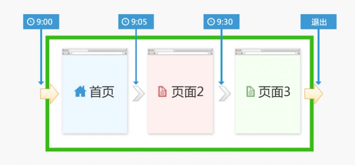 有人访问了你的网站主页,你的网站分析工具则开始为这个访问者计1个Session(会话)。接着这个访问者又浏览了另外两个页面,然后离开了你的网站(离开网站可以是通过关闭浏览器,或在地址栏键入一个不同的网址,或是点击了你网站上链接到其他网站的链接……)为了简单点,我们把这个过程当做一个Session。