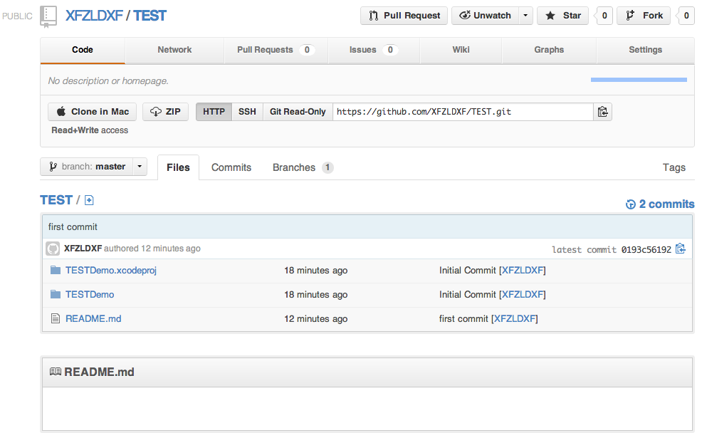 3.打开xcode创建一个工程,比如我创建的工程名TESTDemo,然后打开终端,进入TESTDemo文件夹,输入Creat a new repository on the command line提示的命令