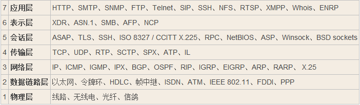 下面的图表试图显示不同的TCP/IP和其他的协议在最初OSI(Open System Interconnect)模型中的位置: