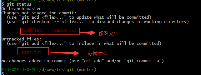 我们在readme.txt再添加一行内容为4444444,接着在目录下新建一个文件为test.txt 内容为test,我们先用命令 git status来查看下状态,如下:
