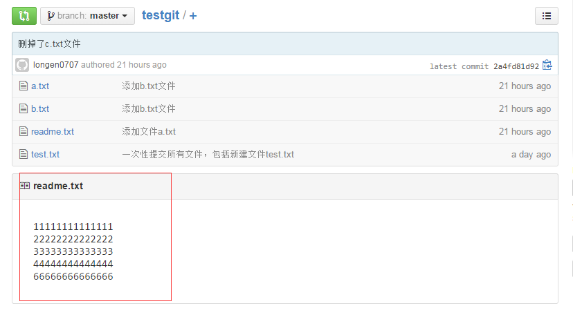 我们可以看到如上,推送成功,我们可以继续来截图github上的readme.txt内容 如下: