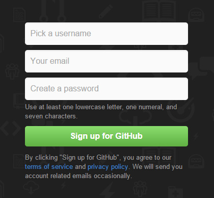 打开https://github.com/,在下图的框中,分别输入自己的用户名,邮箱,密码。
