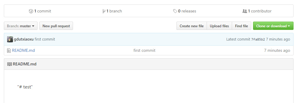 同时我们登陆我们的github 仓库 : https://github.com/gdutxiaoxu/test.git ,可以看到: