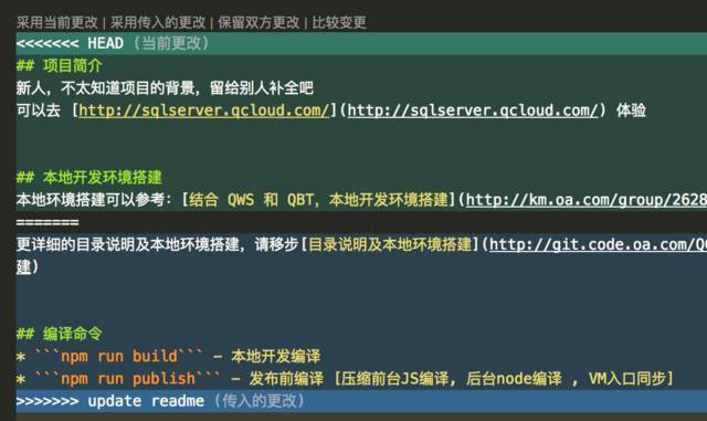相对来说,git merge 处理冲突更直接,而git rebase 能够保证清晰的 commit 记录。 合并 commit 的时候,通常会发生冲突。 可以全局搜索特殊字符比如<<<,找到需要处理的代码位置,然后认真分析应该保留哪一部分代码。