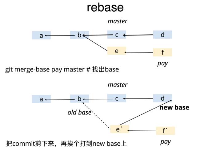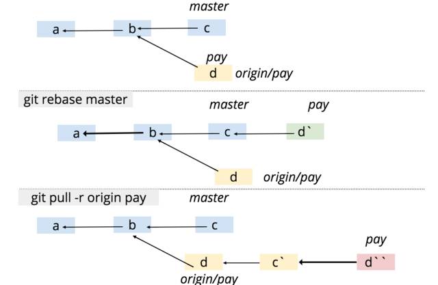 当你不断 rebase master 的时候,其实你本地的 d 都变成了 d' ,再要和远端 pay 分支保持一致,你的本地分支 commit 记录已经不堪入目了。
