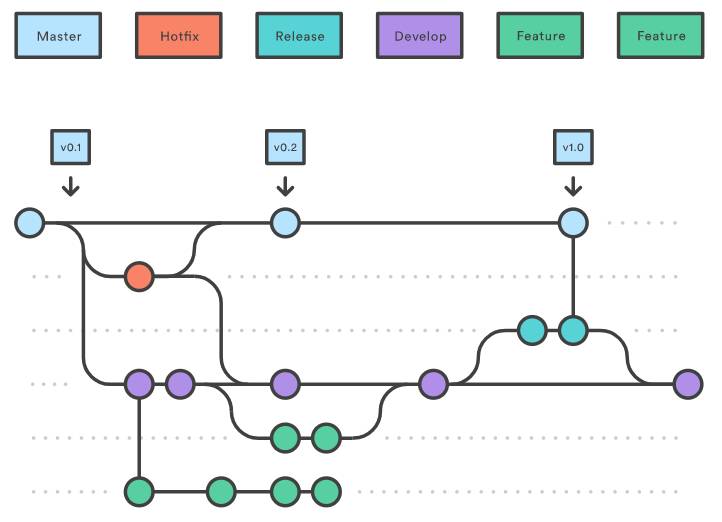 GitFlow 比前文讲的基于功能分支的开发流程要复杂得多,它更适合大型的复杂项目。 它围绕项目发布流程定义了一个严格的分支模型,所有的开发流程都是围绕这个严格的分支模型进行。 而这个模型约定了每个分支的角色,以及他们如何沟通。