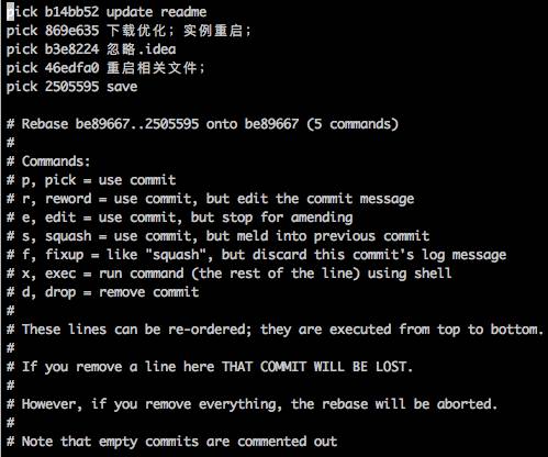 此外还有两种压缩日志的办法: git commit --amend :追加 commit 到上一个 commit 上。 git rebase -i :通过交互式的 rebase,提供对分支 commit 的控制,从而可以清理混乱的历史。