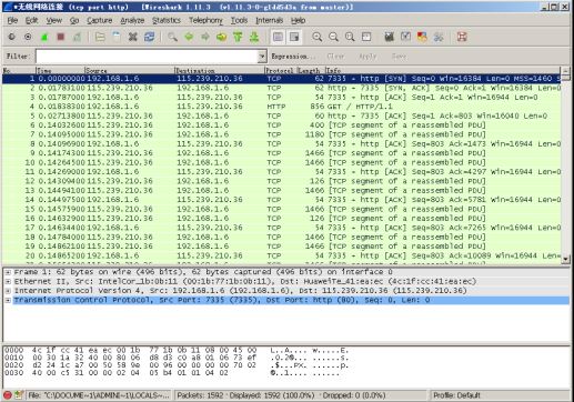 1)No1:浏览器(192.168.1.6)向服务器(115.239.210.36)发出连接请求。此为TCP三次握手第一步,此时从图中可以看出,为SYN,seq:X (x=0);