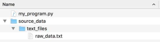 data_folder = "source_data\\text_files\\" file_to_open = data_folder + "raw_data.txt" f = open(file_to_open) print(f.read()) # On a Mac, this code will throw an exception: # FileNotFoundError: [Errno 2] No such file or directory: 'source_data\\text_files\\raw_data.txt'