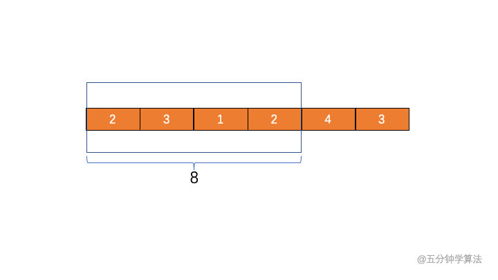 1 .滑动窗口右端 R 开始移动,直到区间满足给定的条件,也就是和大于 7 ,此时停止于第三个元素 2,当前的最优长度为 4