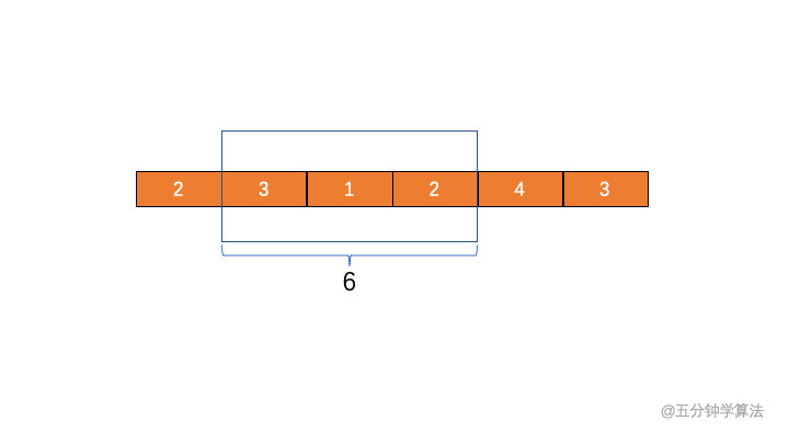 2. 滑动窗口左端 L 开始移动,缩小滑动窗口的大小,停止于第一个元素 3,此时区间和为 6,使得区间和不满足给定的条件(此时不大于 7)