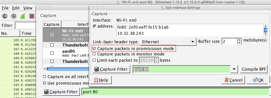 如果设置了混杂模式,你就可以捕获局域网中所有的数据包。如果窗口中的 "Use promiscuous mode on all interfaces"前面的复选框被选中,说明对所有的接口使用混杂模式。如果想单独设置,可以双击接口列表中的接口,会弹出如下的对话框。然后选中或者去掉“Capture packets in promiscuous mode”前面复选框。然后点ok按钮。
