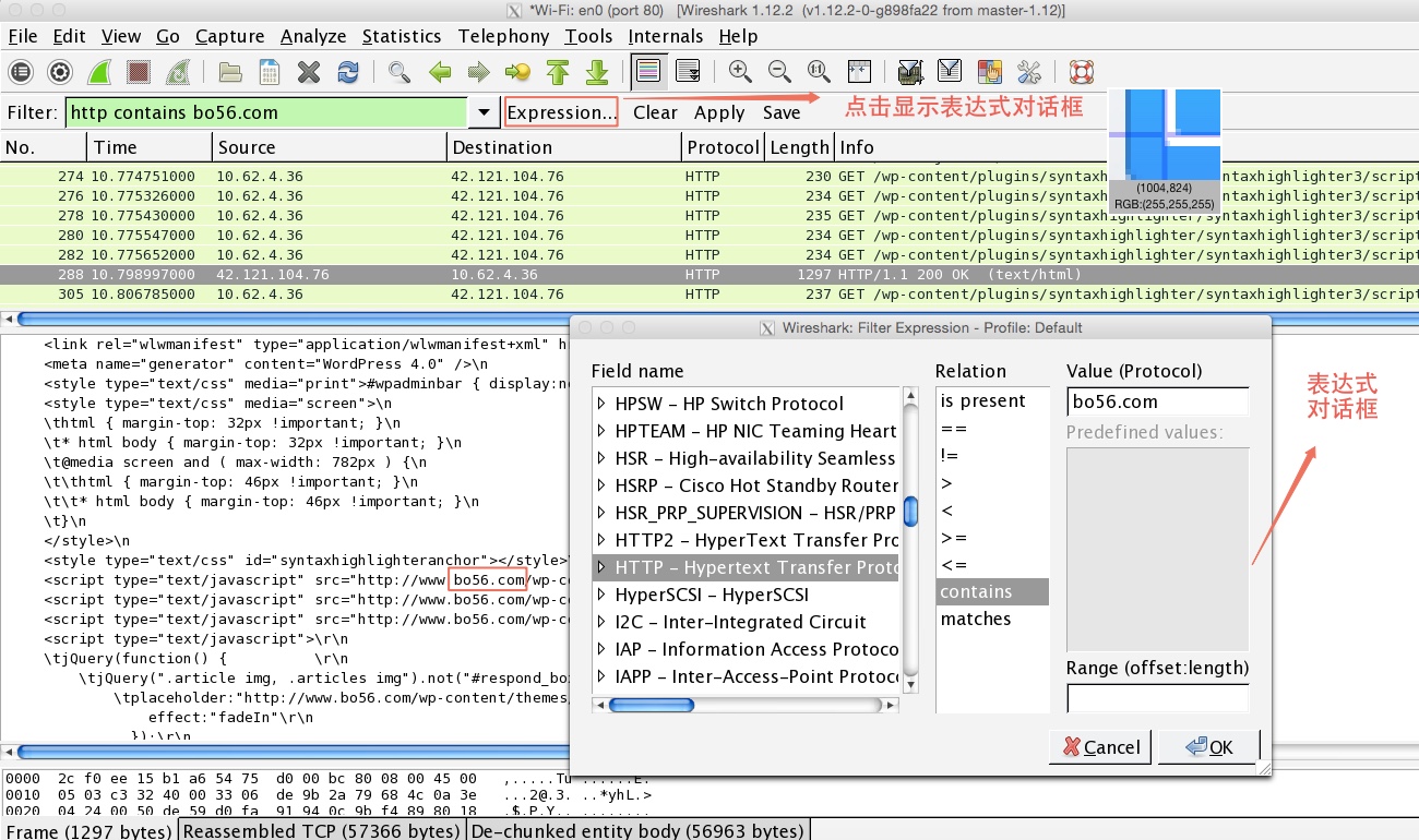 中间为协议域与条件值之间的关系。过滤器表达式对于初学者很有用。如上图,我们创建的表达式的作用是,只显示http协议包中包含关键词“bo56.com”的所有数据包。