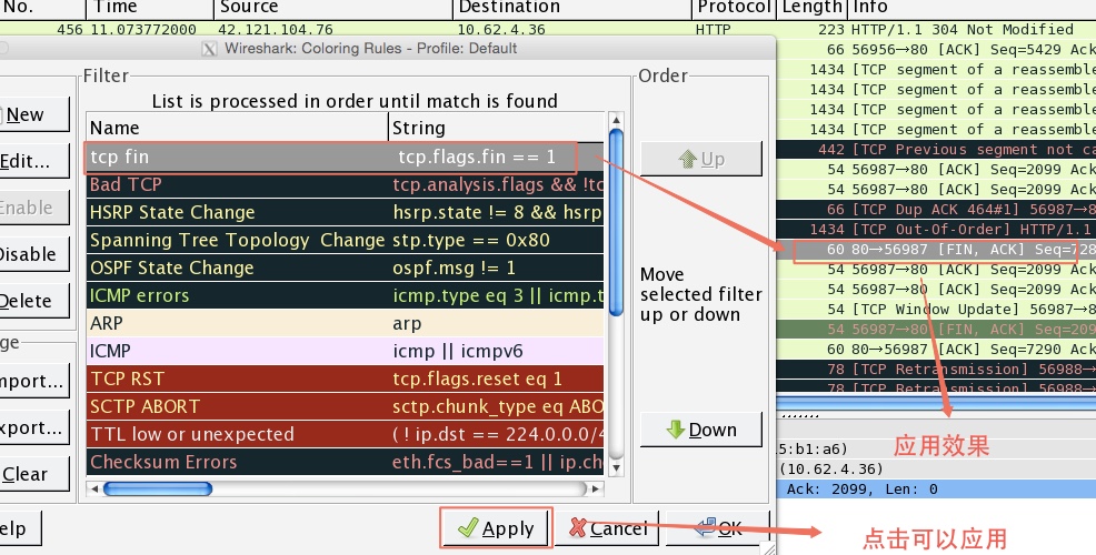 注意:wireshark在应用规则的时候,是按自上而下的顺序去应用规则。因此刚添加的规则会优先应用。如果你想调整顺序,可以选中要调整顺序的规则,然后点击右边的“UP” 或则 “Down” 按钮。