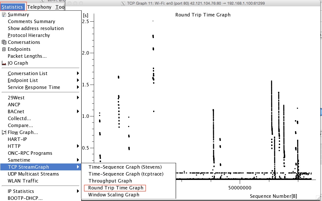 wireshark还有一个功能就是可以对网络传输中的双向时间进行绘图。
