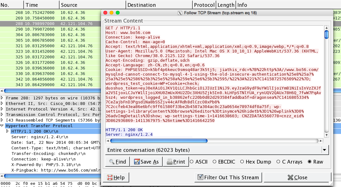 在这个窗口中除了能够看到这些原始数据,你还可以在文本间进行搜索,将其保存成一个文件、打印,或者以ASCII码、EBCDIC、十六进制或者C数组的格式去查看。这些选项都可以在跟踪TCP流窗口的下面找到。
