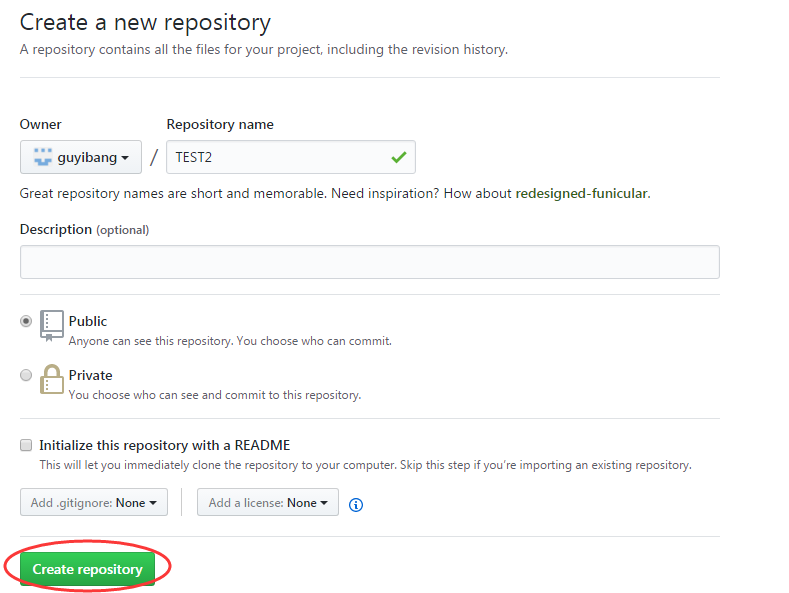 另外,这里有个坑需要注意一下,就是在上面第七步创建远程仓库的时候,如果你勾选了Initialize this repository with a README(就是创建仓库的时候自动给你创建一个README文件),那么到了第九步你将本地仓库内容推送到远程仓库的时候就会报一个failed to push some refs to https://github.com/guyibang/TEST2.git的错。