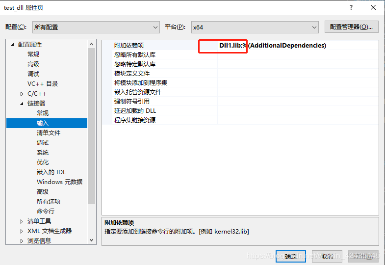 3.容易漏掉的一步,记住千万要把你的添加的lib文件名加入到附加依赖项中,否则会报错。