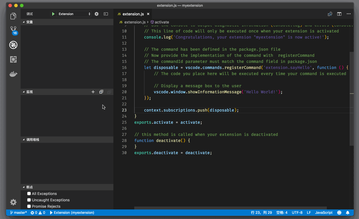 上面我提到了,这个插件只有在 “Hello World” 命令被执行时才会被激活。那下面我们不妨把这个调试窗口关掉,然后再 activate 函数中加上断点,重新试一次。