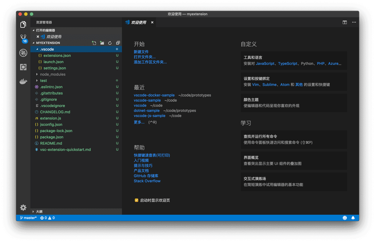 关于主题(Color Theme)、快捷键(Keymap)、代码片段(Code Snippet)的分享,我会在下一讲进行介绍。语言支持之后也会涉及。今天,我们先讲述第二个选项 “New Extension (JavaScript)”。