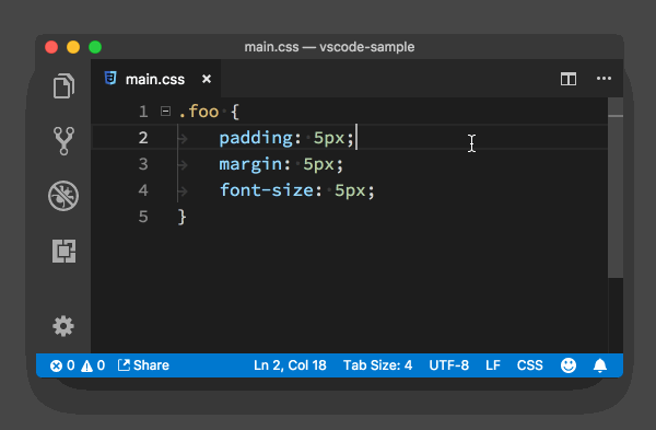 对整个文档进行格式化:Option+Shift+F (win Alt+Shift+F),vscode会根据你使用的语言,使用不同的插件进行格式化,记得要下载相应格式化的插件对选中代码进行格式化: Cmd+K Cmk+F win(Ctrl+K Ctrl+F) 代码缩进 真个文档进行缩进调节,使用Cmd+Shift+P打开命令面板,输入缩进,然后选择相应的命令选中代码缩进调节:Cmd+] Cmd+[ 分别是减小和增加缩进(win 下不知道,自行百度)