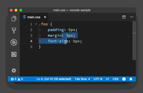 光标的移动基础 移动到行首 Cmd+左方向键 (win Home) 移动到行尾 Cmd+右方向键 (win End) 移动到文档的开头和末尾 Cmd+上下方向键 (win Ctrl+Home/End)在花括号{}左边右边之间跳转 Cmd+Shift+ (win Ctrl+Shift+) 进阶 回到上一个光标的位置,Cmd+U(win Ctrl+U) 非常有用,有时候vue文件,你改了html,需要去下面改js,改完js又需要回去,这时候Cmd+U直接回在不同的文件之间回到上一个光标的位置 Control+- (win 没测试,不知道),你改了a文件,改了b文件之后想回到a文件继续编辑,mac使用controls+- 文本选择 你只需要多按一个shift键就可以在光标移动的时候选中文本选中单词 Cmd+D 下面要讲的多光标也会讲到Cmd+D 对于代码块的选择没有快捷键,可以使用cmd+shift+p打开命令面板,输入选择括号所有内容,待会说下如何添加快捷键