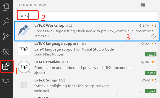 首先,打开VSCode,根据图中的步骤,安装LaTex Workshop,我的已经安装过了,所以没显示Install