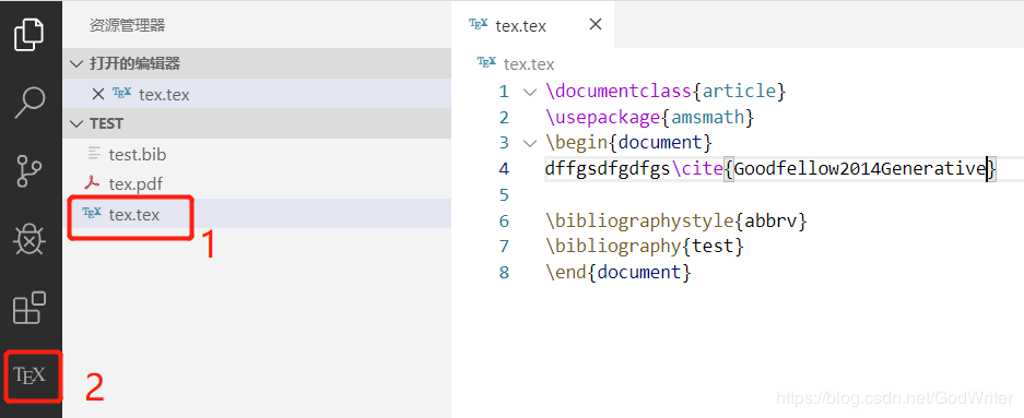 做好上述的步骤,那么你就配置好了LaTex,此时,你再重启VSCode即可编译LaTex了。新建一个.tex后缀的文件或者打开一个.tex结尾的文件,如下图所示,就会出现TEX这个图标